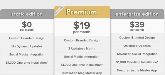 Custom design and installation starts at $1,000. Sign up for an affordable sub-scription with several updates for only $19/month or choose to keep the site static with core info only. No long-term contracts!